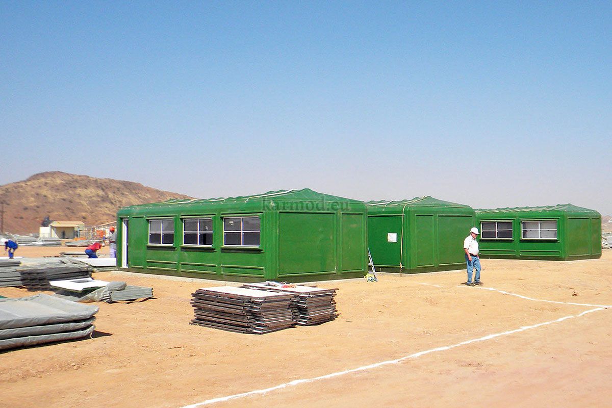 This work site cabins established by Karmod for the Eritrea gold mine extraction work site are used as offices and workers accommodation. A total area of 2129 m² was used for gold mining workers accommodation in the work site, 6 cabins with 3.9 x 18.3 m dimensions, 14 cabins 3.9 x 12.3 m, 24 pcs 3.9 x 9.9 m, and 1 pcs 3.9 x 8 m, and other models makes a total number of 70 cabins.